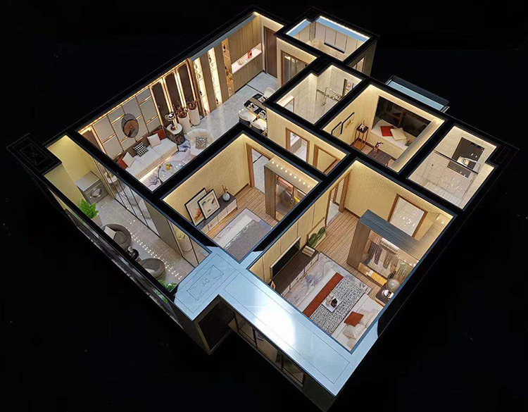 為了更能突出居室內(nèi)部的效果,我們在燈光設(shè)置方面先進(jìn)的科技技術(shù),通過實(shí)際的局部設(shè)計(jì)壁燈、落地?zé)簟⒋差^燈、水晶吊燈等表現(xiàn)出來并能發(fā)光,通過戶內(nèi)的裝飾效果與燈光效果相襯托,把整個(gè)剖面模型的居家氣氛表現(xiàn)出來。為了更好營造模型采用進(jìn)口材料和裝飾品,并且能夠以歐式、美式等不同裝修風(fēng)格呈現(xiàn),打造出戶型的獨(dú)特風(fēng)韻。