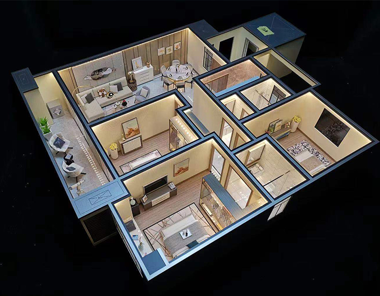 為了更能突出居室內(nèi)部的效果,我們在燈光設(shè)置方面先進(jìn)的科技技術(shù),通過實(shí)際的局部設(shè)計(jì)壁燈、落地?zé)簟⒋差^燈、水晶吊燈等表現(xiàn)出來并能發(fā)光,通過戶內(nèi)的裝飾效果與燈光效果相襯托,把整個(gè)剖面模型的居家氣氛表現(xiàn)出來。為了更好營造模型采用進(jìn)口材料和裝飾品,并且能夠以歐式、美式等不同裝修風(fēng)格呈現(xiàn),打造出戶型的獨(dú)特風(fēng)韻。