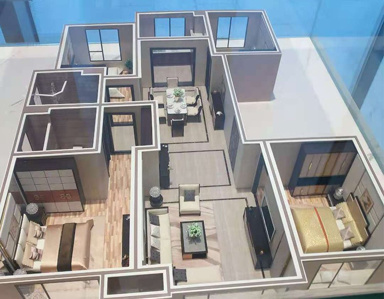 戶型模型是房間按平面圖劃分的功能進(jìn)行精心的布置,室內(nèi)按各起居室功能不同裝飾貼上精美的墻紙、地毯、地板、大理石、面磚等。以不同的裝飾品來襯托出房間、格局的功能和用途。戶型內(nèi)部家居的裝飾、配置可根據(jù)戶型的風(fēng)格不同而變化。戶型的大陽臺(tái)和平臺(tái)上布置些植物綠化,擺設(shè)太陽傘、休閑的躺椅等,體現(xiàn)出一個(gè)和諧、安適的居室。戶型裝飾的家私等配置全部通過手工打磨精雕細(xì)刻制作。